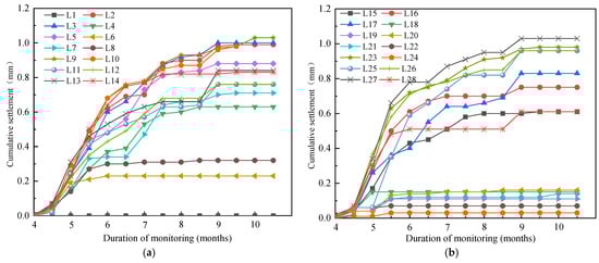 It can be seen from Figure 9 that the cumulative settlement of the L1 monitoring point is 0. Except for the L1 monitoring point, the cumulative settlement of other monitoring points increased at first and then remained basically unchanged. The settlement of L6, L8, L18, L19, L20, L21, L22, and L24 monitoring points remained basically unchanged after the 7th month, and the settlement of the other monitoring points remained basically unchanged after the 9th month. The maximum cumulative settlement occurred at the L10 monitoring point, and the displacement was 1.14 mm, which did not exceed the alarm value and therefore met the design requirements. This shows that there was no obvious settlement of the column in the whole process of foundation pit excavation and foundation construction, and the cumulative settlement and settlement rate did not exceed the alarm value in the whole process, thus meeting the requirements of the design.