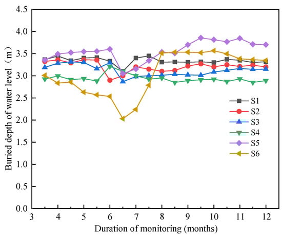 Six groundwater level observation holes were arranged along the key parts within 2 m outside the periphery of the foundation pit, numbered S1 to S6. The monitoring results of the groundwater level are shown in Figure 10.