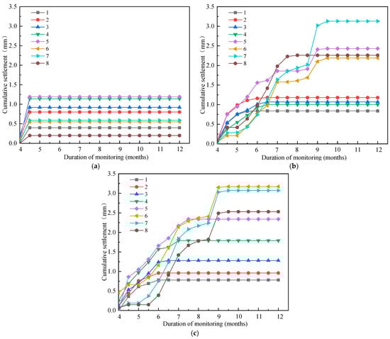 It can be seen from Figure 12 that, before the 8th month, the cumulative settlement of each monitoring point increased with the increase in the excavation depth of the foundation pit. From the initiation of the project to the 4.5th month, the cumulative settlement of the monitoring points increased at a large rate. From the 4.5th month to the 8th month, the cumulative settlement growth rate of the monitoring points decreased significantly. After the 8th month, the cumulative settlement of each monitoring point remained basically unchanged. The point of the maximum cumulative settlement was the J7 monitoring point, with a deformation value of 12.42 mm. The minimum cumulative settlement occurred at the J17 monitoring point, with a deformation value of 7.05 mm. This shows that the whole foundation pit excavation and foundation construction process of the project did not have a significant impact on the surrounding buildings, and the monitoring data did not exceed the alarm value, thus meeting the design requirements.