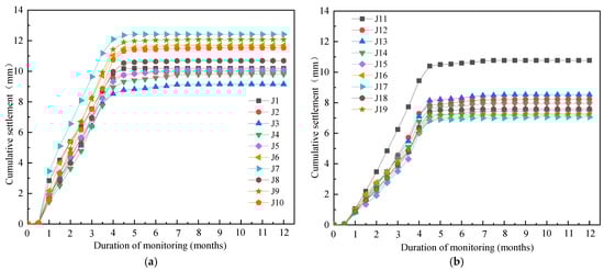 The time history curve of cumulative settlement of surrounding buildings: (a) the time history curve of cumulative settlement at J1 to J10 monitoring points; (b) the time history curve of cumulative settlement at J11 to J19 monitoring points.