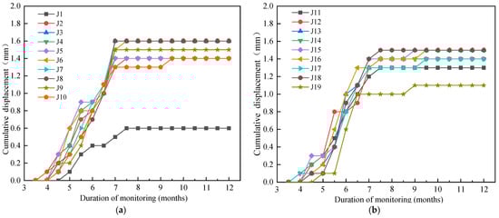 The time history curve of cumulative horizontal displacement of surrounding buildings: (a) the time history curve of cumulative horizontal displacement at J1 to J10 monitoring points; (b) the time history curve of cumulative horizontal displacement at J11 to J19 monitoring points.