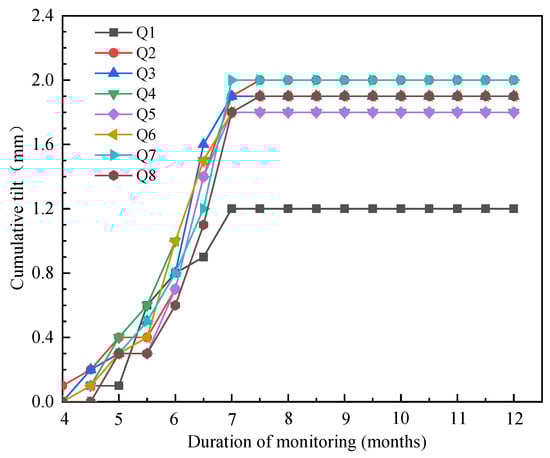 It can be seen from Figure 14 that, before the 7th month, when the foundation pit was excavated, and the foundation was constructed, the cumulative tilt of the surrounding buildings increased with the excavation depth of the foundation pit. After the 7th month, when the foundation pit excavation and foundation construction were completed, and the basement shear wall construction started, the cumulative tilt of the surrounding buildings remained basically unchanged. During the whole monitoring process, the point with the maximum cumulative tilt was the Q2 monitoring point, and the tilt value was 2.0 mm. The point with the minimum cumulative tilt was the Q1 monitoring point, and the tilt value was 1.2 mm. This shows that the whole foundation pit excavation and foundation construction process of this project did not have a significant impact on the surrounding buildings, and none of the monitoring data exceeded the alarm value, which met the design requirements.