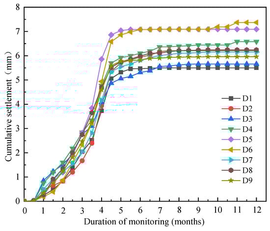 It can be seen from Figure 15 that, before the 8th month, the cumulative settlement of each monitoring point increased with the increase in the excavation depth of the foundation pit. From the start of the project to the 4.5th month, the cumulative settlement growth rate of the monitoring point was relatively fast, and from the 4.5th month to the 8th month, the cumulative settlement growth rate of the monitoring point decreased significantly. After the 8th month, the cumulative settlement of each monitoring point remained basically unchanged. In the whole monitoring process, the maximum cumulative settlement occurred at the D6 monitoring point, and the settlement value was 7.37 mm. The minimum cumulative settlement occurred at the D1 monitoring point, and the settlement value was 5.50 mm. This shows that the whole process of foundation pit excavation and foundation construction had no obvious impact on the surrounding surface and underground pipelines, and the monitoring data of the project did not exceed the alarm value, which met the design requirements.