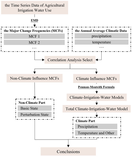 The analysis process is illustrated in Figure 1. Initially, the Empirical Mode Decomposition (EMD) technique was applied to dissect the time-series data of irrigation water use, revealing the significant change frequencies. Subsequently, through correlation analysis and statistical testing, the key change frequencies susceptible to climatic influences were identified. Using the Penman–Monteith formula as a foundation, distinct climatic models for irrigation water use were formulated corresponding to each selected significant change frequency. Ultimately, an overarching climatic irrigation water use model was established by integrating all the individual models, offering a comprehensive representation of the impact of climate factors. Concurrently, the change frequencies not influenced by climate factors were attributed to non-climate forces. Within the non-climate segment, a division was made between the basic and perturbation states for further analysis.