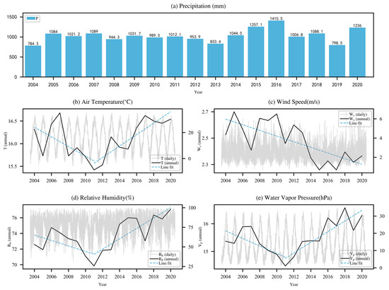 The climate factor in Jiangsu Province from 2004 to 2020: (a) the histogram of the total annual precipitation; (b) the average annual and daily values of air temperature; (c) the average annual and daily values of wind speed; (d) the average annual and daily values of relative humidity; and (e) the average annual and daily values of water vapor pressure. The daily value axis of (b–e) is on the right.