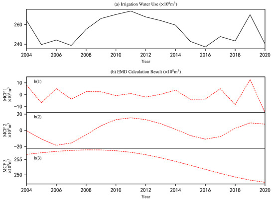 The calculation of the irrigation water use series based on the EMD is depicted in Figure 3b. There were three main change frequencies for irrigation water use, namely MCF1, MCF2 and MCF3. The MCF1 (Figure 3(b1)) was a 2-to-3-year period varied over a ±1.00 billion m3 range. It exhibited significant fluctuations during 2004–2007 and 2016–2020, while remaining relatively stable during the other years. The MCF2 (Figure 3(b2)) varied over a ±2.00 billion m3 range throughout 10 years. There was a complete cycle change during 2006–2016. Simultaneously, the amplitude of this cyclic variation gradually decreased. For instance, the lowest amplitude in 2006 was −1.84 billion m3, while it was −1.09 billion m3 in 2016, with an overall declining rate of 0.08 billion m3/year. The MCF3 (Figure 3(b3)) exhibited a consistent decreasing pattern, declining from 25.67 billion m3 to 24.76 billion m3 between 2004 and 2020. It also showed that the irrigation water use generally had a downward trend with a decreasing rate of 0.05 billion m3/year.