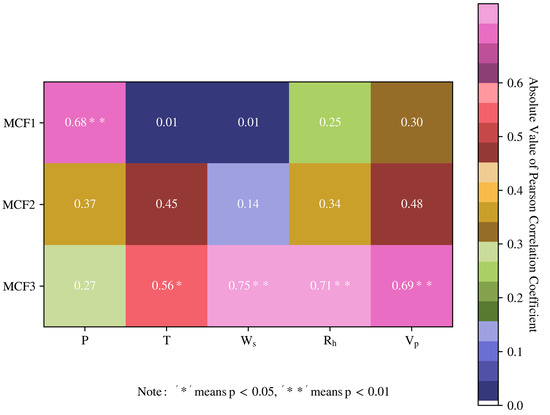 The correlation between climatic factors and MCF1, MCF2, and MCF3 is presented in Figure 4. The findings indicated that precipitation exhibited the highest correlation with MCF1, with a Pearson correlation coefficient of 0.68, and this correlation was statistically significant (p < 0.05). Air temperature, wind speed, relative humidity, and water vapor pressure had correlation coefficients of 0.56, 0.75, 0.71, and 0.69, respectively, with MCF3, all of which were significant at a p < 0.05 level. However, the relationship between MCF2 and these climate factors was weak and non-significant, implying that non-climatic factors potentially influenced MCF2.