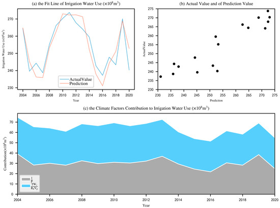 The estimated irrigation water use using Equation (19) is shown in Figure 5. The results showed that the trend in irrigation water use simulated by Equation (19) was consistent with the observed trend. The time-series plot in Figure 5a indicated a good simulation of the real change in irrigation water use. A scatter plot of the simulated and true irrigation water use showed that the points were evenly distributed around the 1:1 line (Figure 5b). The model’s RMSE was 0.06 billion m3, accounting for 2.24% of the average irrigation water use. It means a lower model error and better simulation of irrigation water use.