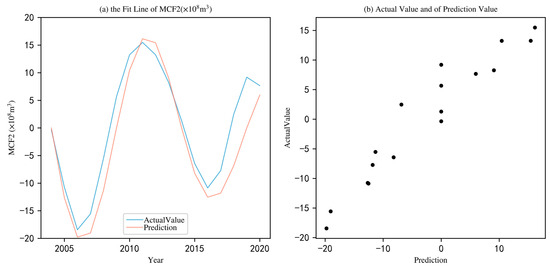 The parameters in Equation (18) were solved using the least-squares algorithm. Then, based on the superposition of individual models, the Climate–Irrigation–Water Model was obtained, as shown in Equation (19). The fitting effect R2 of was 0.50, and the fitting effect R2 of was 0.68.