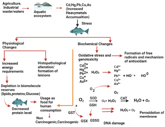 The excess of ROS Indicates an imbalance in the production of ROS and causes oxidative stress, which eventually interferes with cellular function by damaging lipids, proteins and DNA [41]. Enzymes such as superoxide dismutase (SOD), catalase (CAT), glutathione S transferase (GST), and non-enzymatic compounds such as reduced glutathione (GSH) are essential in maintaining the dynamic balance of ROS through detoxification. SOD converts superoxide free radicals into hydrogen peroxide, which is further broken down into non-toxic oxygen and water by the CAT enzyme [42]. GST aids in detoxification by catalysing the conjugation of electrophiles to GSH. However, electrophilic substances (free radicals and ROS) can also oxidize GSH non-enzymatically to glutathione disulfide. Any hindrance in the enzymatic reaction can generate excess ROS that accumulates in fish tissues, leading to oxidative stress. ROS can degenerate the cell membrane through lipid peroxidation, causing genotoxicity through DNA damage [41]. There is a wealth of information on the effects of metallic trace elements on fish physiology in various fish species. However, this review focuses on the impact of specific metallic trace elements on particular fish systems, such as the nervous system, reproductive system, etc.