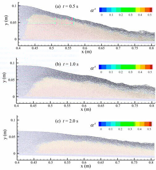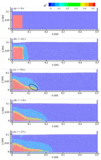 Figure 3c). The sediment particles can be suspended because in the early stage of the collapse, the rapid collapse of a large amount of sediment causes a vortex in the water, and the vortex causes the suspension of the sediment at the front position, but as the collapse continues and propagates forward, the suspended sediment settles down again quickly. This phenomenon was also captured in the experiments of Wang et al. [