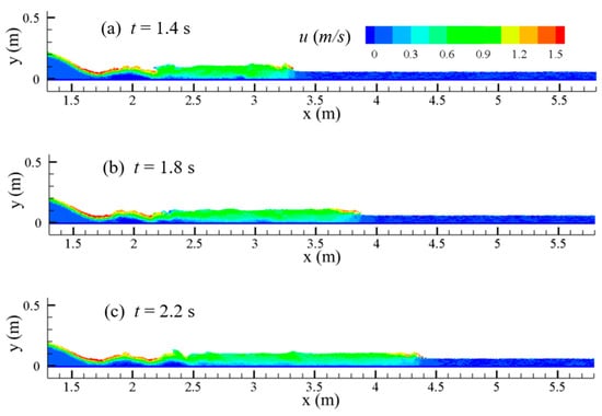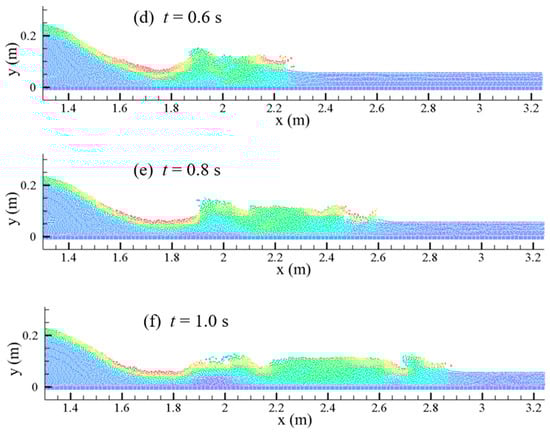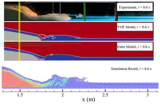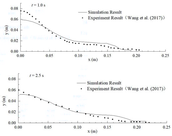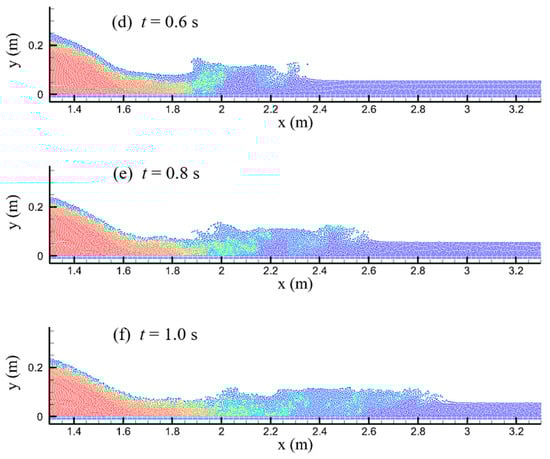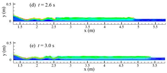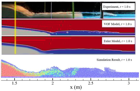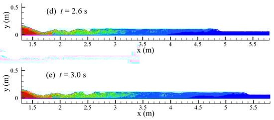 t = 1.0 s, all three mathematical models can obtain the forward wave propagation to the 2.9 m position. One advantage of the model developed in this study is that it can simulate the distance of water–sand mixing very well. The simulation results show that the water–sand mixing can reach 2.35 m, while in the experimental test it reaches 2.4 m; thus, the two results are remarkably close. Another advantage is considering the accurate replica of the simulation of the water fall, which agrees well with the experiment.