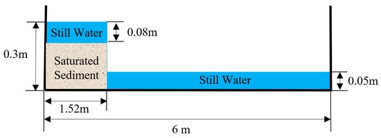 39], and the test flume was rectangular, 6 m long, 0.3 m wide, and 0.32 m high, with a baffle separating the upstream and downstream at a horizontal 1.52 m position, and 4.48 m long downstream, with the baffle instantaneously withdrawn to simulate the dam break process, and the initial arrangement schematic is shown in