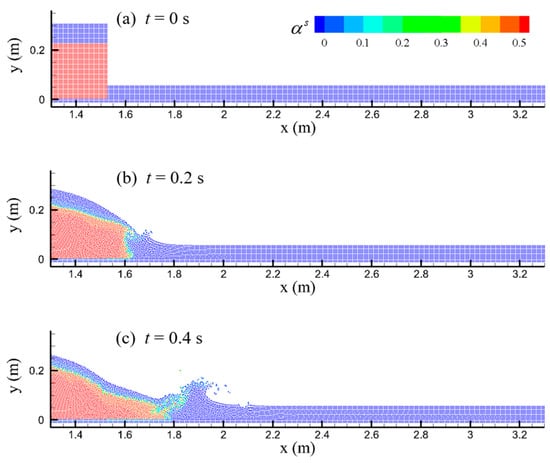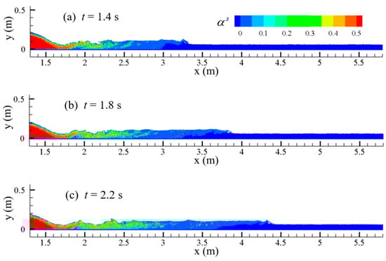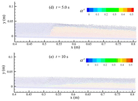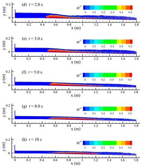 t = 3 s, this part of the particles spread as far as 4.2 m, and the sediment phase volume fraction of these water–sand mixing particles is negligible.