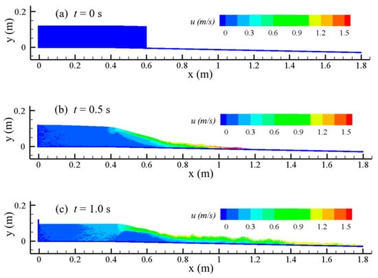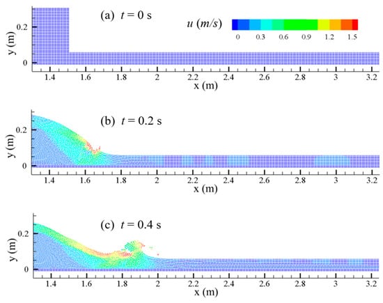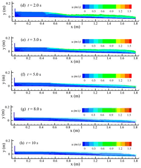 Figure 11. The initial water body and the barrier dam are kept stationary, the volume fraction of the sediment phase of the barrier dam at the initial moment is set to the uncompacted initial sediment volume fraction of 0.53, the barrier dam is 0.1 m high and 0.2 m long, the upstream water depth is 0.12 m, the total channel length is 1.8 m, and the channel slope is 2%. Because the water stored in the barrier dam is much larger than the upstream-supplying discharge, the upstream-supplying discharge is ignored when the barrier dam break process is simulated. The barrier dam break process and flow velocity distribution are shown in