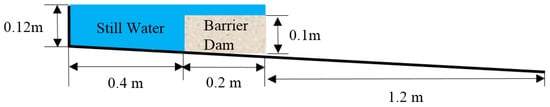 In general, the length of a barrier dam along the river direction is much larger than the width of the dam perpendicular to the river direction, and it is necessary to focus on the changes along the river direction during the barrier dam break. Therefore, in this section, the established 2D water–sand two-phase flow model is applied to simulate the evolution of the diffuse topping out of a barrier dam. Considering that the barrier dam, once formed, will completely block the river, the initial state downstream of the barrier dam is set as a dry riverbed.