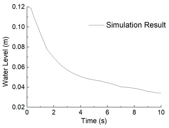 Figure 14 shows the change of the water level in the reservoir over time. At 3 s after the dam break, the water level dropped to 0.06 m; 10 s after the dam break, the water level dropped to 0.03 m. After the dam break occurred, the water in the barrier dam was discharged rapidly, and the water level in the reservoir dropped quickly. From the slope of the curve, it can be seen that the decline rate of water level firstly in-creased and then decreased, so the surface flow velocity at the dam break site also changed accordingly. The velocity distribution after the barrier dam break is shown in