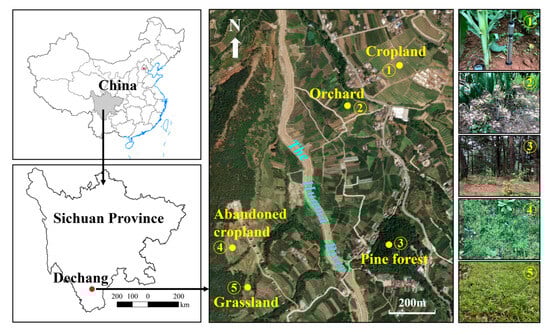 The selected study area is in Dechang County, Liangshan Prefecture, Sichuan Province, with a specific location of 102°11′5″ E, 27°19′40″ N. It is approximately 70 km south of Xichang and within the dry–hot valley region that is described by Shen et al. (2003) [29]. The elevation ranges from 1360 m to 1450 m. This area belongs to a typical subtropical climate zone, and the average annual temperature is 17.7 °C. There are as many as 350 days when the temperature is above 10 °C every year. The mean temperature of the coldest month is over 12 °C, while the mean temperature of the warmest month is between 24 and 28 °C [30]. The average annual precipitation is 800–1100 mm and is severely unevenly distributed. June to October is considered the wet season, with 80–90% of precipitation concentrated in this period. The hot, dry season (November–May) receives approximately only 10% of the annual rainfall. In this region, the dominant soil type could be classified as Red Soil according to the Chinese Soil Database [31] and the Soil Series of Sichuan [32] with the typical soil profile data listed in Table 1. According to the World Reference Base (WRB) international soil classification system, the local soils are Lixisols, which have low leaching and high soil expansion due to climate conditions [33]. The soil formed in quaternary fluvial-lacustrine deposits is vulnerable to erosion [34]. The main types of land use in the area include agricultural land, forestland and natural grassland, accounting for 5.3%, 53% and 40% of the total land area, respectively. Forestland mainly includes the following plant species: Pinus yunnanensis, Pinus yunnanensis, and Quercus alpine. Agricultural lands can also be subdivided into croplands and orchards.