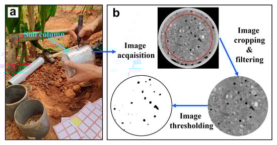Soil column sampling (a) and procedures of CT scanning image processing (b).