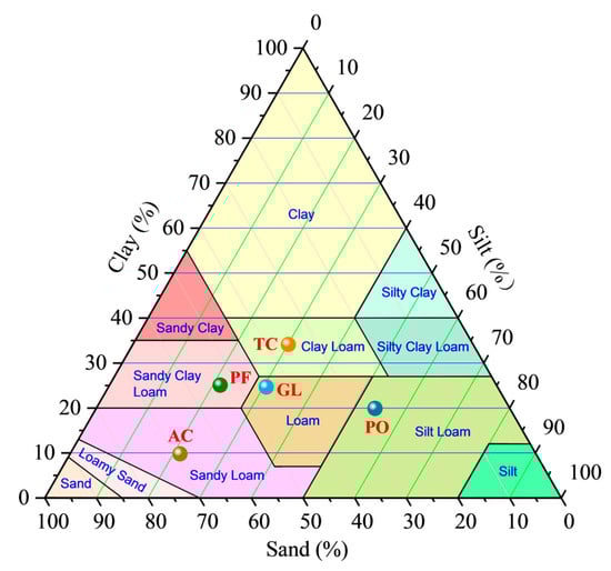 The soil texture for five experimental sites of different land use types. TC: traditional corn; PO: plum orchard; PF: pine forest; GL: grassland; AC: abandoned cropland.