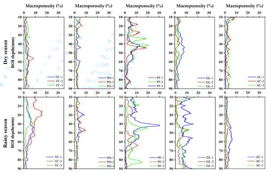 To study the variation in macroporosity with depth, the macroporosity distribution for each sample along the ROI depth was determined for each slice with a 0.265 mm increment. Generally, the macroporosity variation with depth followed a similar distribution for all land uses, which decreased with profile depth. In the rainy season, relatively larger fluctuations in macroporosity values along the ROI depth were observed than in the dry season for the five land uses (Figure 4). The growing season of corn coincides with the rainy season, and the macroporosity of TC in the rainy season was significantly higher in the top 60 mm of soil than that in the dry season. Whether in the dry season or rainy season, the fluctuation range of PF and GL macroporosity along the ROI depth was clearly greater than that of the other three land uses.