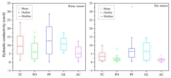 The hydraulic conductivity of five land uses was statistically analyzed, and the results are shown in Figure 5. The minimum hydraulic conductivity was observed in PO during the dry season, with a value of 0.23 cm/d, and the maximum in PF during the rainy season, with a value of 32.92 cm/d. The standard deviation for PF hydraulic conductivity was much greater in the rainy season. The hydraulic conductivity of soil in the rainy season was significantly better than that in the dry season (p = 0.03). The hydraulic conductivities of TC, PO, PF, GL and AC in the rainy season were 2.67 times, 2.74 times, 2.07 times, 1.86 times and 4.26 times higher than those in the dry season, respectively. There were also significant differences in hydraulic conductivity among different land use types in the same season. Regardless of the season, the hydraulic conductivity of the five land uses can be ranked as follows: PF > GL > TC > PO > AC. The hydraulic conductivity of PF was 63.71% and 82.42% higher than that of AC in the rainy season and dry season, respectively. In addition, the hydraulic conductivity of AC had the largest seasonal difference among all land uses, and its hydraulic conductivity in the rainy season was 76% higher than that in the dry season. In contrast, the hydraulic conductivity for PF in the wet season was only 36.42% higher than that in the dry season, and the seasonal difference was the smallest among all treatments.