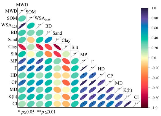 Correlation analysis between soil hydraulic conductivity and soil properties. Note: MWD: mean weight diameter; WSA0.25: percentage content of water-stable aggregates greater than 0.25; SOM: soil organic matter; BD: bulk density; MP: macroporosity; MD: mean diameter of macropore; HD: hydraulic radius; Γ: global connectivity; CP: compactness; K(h): hydraulic conductivity; CI: cumulative infiltration.