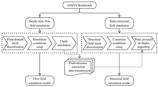 Here, , and refer to the matrix of structure mass, structural damping, and structural rigidity, respectively. , and denote the nodal acceleration vector, the velocity vector, and the displacement vector, and represents the fluid load vector. The solution flow chart of one-way FSI adopted in this paper is shown in Figure 1.