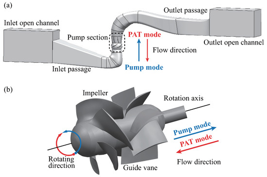 Schematic diagram of (a) integral flow channel and (b) pump section of axial-flow pump device.