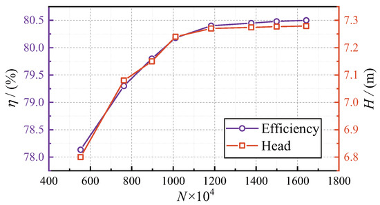 In this study, ANSYS ICEM was used to discretize the fluid domain of the entire axial-flow pump device. The discretization was carried out using unstructured grids, while structured grids were used to discretize the inlet and outlet channels. In order to ensure accurate flow solutions, local refinements of the grid were performed in critical areas such as the impeller and guide vanes, where complex flows exist. Initially, eight grid configuration schemes were established, and the head and efficiency of the axial flow pump under each scheme were computed. Figure 3 shows the verification curve of grid independence of the fluid domain. Both efficiency and head increase with the increase in the number of grids, indicating gradual convergence. When the number of grids exceeds 11.83 million, the degree of change in head and efficiency with the number of grids becomes very small.