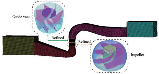 Therefore, after considering the comprehensive factors of efficiency and computational accuracy, the final total number of grids was determined to be 11.83 million grid cells, of which the inlet passage accounted for 3.4 million, the impeller part accounted for 2.83 million, the guide vane part accounted for 2.8 million, and the outlet passage part accounted for 2.8 million. The grid quality reached 0.32, which met the requirements for accurate simulation. A schematic diagram of the meshing result of the pump device is shown in Figure 4.