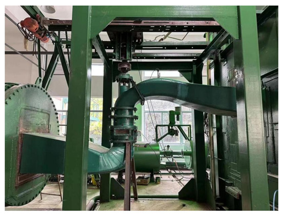 To verify the reliability of the numerical simulation results, model tests were conducted for the pump mode and the PAT mode of the axial-flow pump at a rated speed in this study. The experiments were carried out on the hydraulic machinery multi-functional model test bench of Hohai University [35], as shown in Figure 5. The total uncertainty of the experiment was less than 0.4%. The diameter of the model pump impeller was D = 300 mm, and the experimental rotation speed was 1305.8 r/min. The experimental results were converted to the values of the prototype axial-flow pump according to the similarity law and compared with the simulated efficiency and head. The comparison results are shown in Figure 6. The trend of efficiency and head with flow rate in a numerical simulation is consistent with the experimental results, but the numerical simulation overestimates the efficiency and head slightly. This is partly due to the large roughness and leakage losses of the model pump in the experiment. The maximum error at each flow rate condition did not exceed 3%; thus, the numerical calculation results can be considered acceptable.