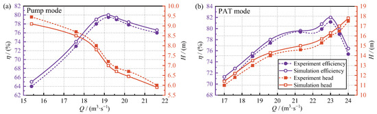 Comparison between simulation and experiment values of head and efficiency for axial-flow pump under (a) Pump mode and (b) PAT mode.