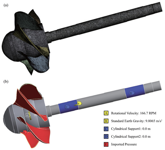 When performing a one-way FSI computation on the axial-flow pump device, it is necessary to add constraint conditions in various directions of the blade. Figure 7b shows the constraint conditions added to the blades, where A represents the gravity constraint (Standard Earth Gravity), and the acceleration due to gravity is set to 9.8066 m/s. B represents the circumferential velocity (Rotational Velocity), and the rotating centrifugal force acts on the structural part of the blade during rotation. The rotational speed of the impeller is set to 166.7 r/min. C and D represent cylindrical constraints (Cylindrical Support), which prevent displacement of the rotating part of the impeller. E represents the pressure-bearing surface (Imported Pressure), where the water pressure on the surface of the blade computed from the steady-state flow field is imported to this pressure-bearing surface.