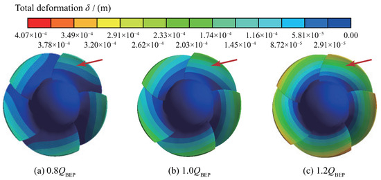 Figure 8 shows the solid total deformation of the blade of the axial-flow pump device operating in pump mode at , , and flow rates. The maximum deformation of the blade is mm at , mm at , and mm at . As the flow rate increases, the maximum deformation on the blade surface gradually increases. The main deformation distribution of the blade is increasing gradually from the hub along the wheel rim, while there is almost no deformation at the hub. The deformation gradient near the hub is relatively small, and the increase in radial deformation is slow. The maximum deformation occurs at the water-inlet edge of the blade pressure surface (PS), and the deformation gradually decreases along the circumferential direction towards the water-outlet edge. This is because the thickness of the blade is the thinnest at the water-inlet edge and the thickest at the hub.