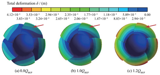Total deformation of blades under the flow rate of (a) , (b) and (c) in pump mode.