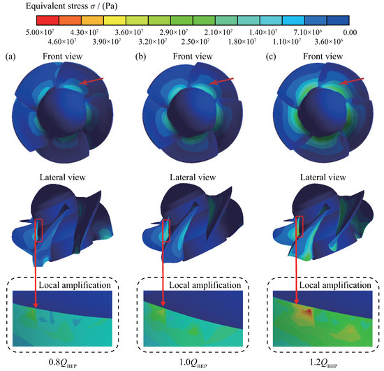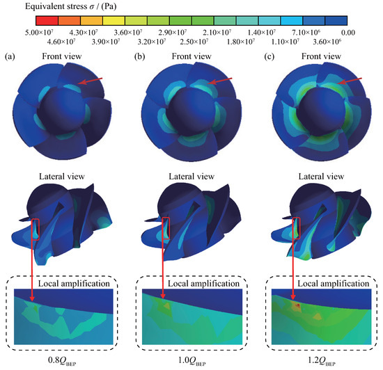 where , and are principle stresses. The distribution of the equivalent stress of the blade of the axial-flow pump device operating in the pump mode and the PAT mode at the above-mentioned three different flow rates is shown in Figure 10 and Figure 11. Stress concentration occurs at the root of the blade in both modes, which may cause fatigue cracks and static load fracture in the blade. The maximum equivalent stress is at the root of the blade on the SS, and the stress on the blade decreases gradually from the root near the hub to the rim, which is caused by the shape of the blade. It can be observed that the back of the blade is more prone to flow separation near the position close to the hub, leading to a significant difference in equivalent stress between the front and back of the blade.