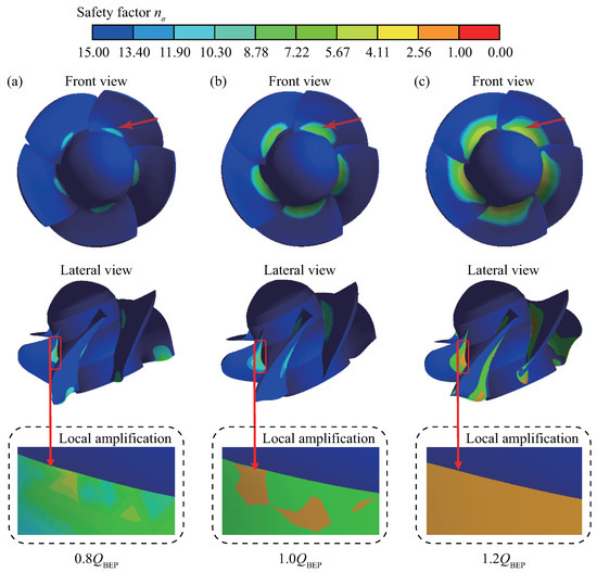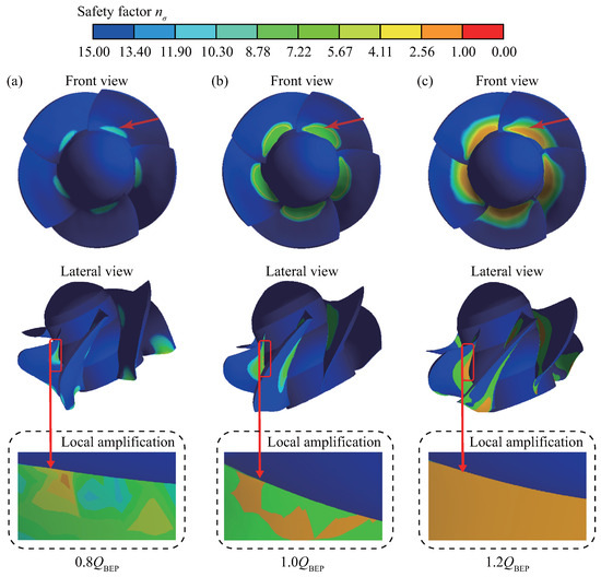 Blade safety factor under the flow rate of (a) , (b) and (c) in PAT mode.
