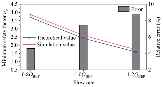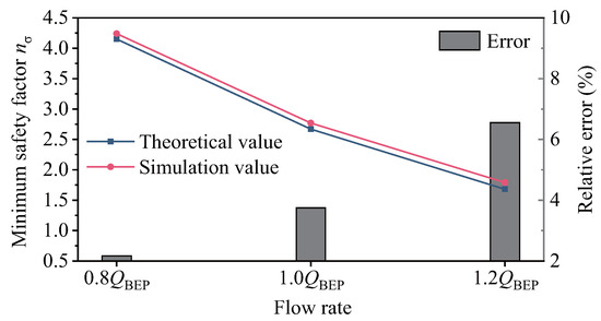 Figure 12 depicts the distribution of blade safety factors of the axial-flow pump device in the pump mode at , , and flow rates. In all operating conditions, the region where the minimum safety factor of the blade is located is at the connection between the blade root and the hub, while the safety factor is significantly higher at the blade tip. The amplified area in the figure shows the region where the minimum safety factor is located, and the distribution characteristics under each operating condition exhibit a noticeable regular pattern. The minimum safety factor at is , at it is , and at it is . As the flow rate increases, the safety factor of the blade root decreases, making it more susceptible to damage, which is consistent with the pattern observed at the maximum equivalent stress of the blade. Additionally, Figure 13 compares the blade safety factors of the impeller obtained from numerical simulation and theoretical analysis for the axial-flow pump device operating in the pump mode at the three different flow rates mentioned above, and the relative error is provided. The relative error between the simulated minimum safety factor and the theoretical value increases with the flow rate. At a flow rate, the relative error of the minimum safety factor is 2.17%, while it is 3.75% at . The maximum error is 6.55% at a flow rate because as the flow rate increases, the relative error in the solution denominator decreases due to the decrease in the safety factor. The absolute error is within the acceptable range, which verifies the accuracy and reliability of the numerical simulation results for the safety factor.