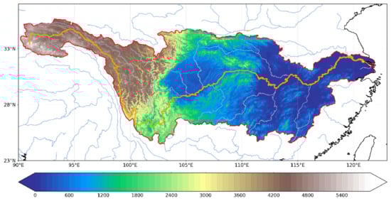 The Yangtze River Basin (Figure 1), spanning from 24° N to 35° N and 90° E to 122° E, ranks as the third-largest river basin globally. Encompassing 19 provinces, cities, and autonomous regions across eastern, central, and western China, the basin hosts an intricate water network. Encompassing a vast expanse of 1.8 million km2, it constitutes 18.8% of China’s total land area [16]. Despite its substantial average precipitation of 1126 mm over multiple years, the basin’s spatial distribution exhibits unevenness, manifesting a decreasing trend from the southeast to the northwest [4,6]. The basin experiences high population density, and owing to the impact of the monsoon climate, precipitation displays uneven distribution. Frequent occurrences of both floods and droughts, along with water-scarcity issues, stand out as significant challenges.