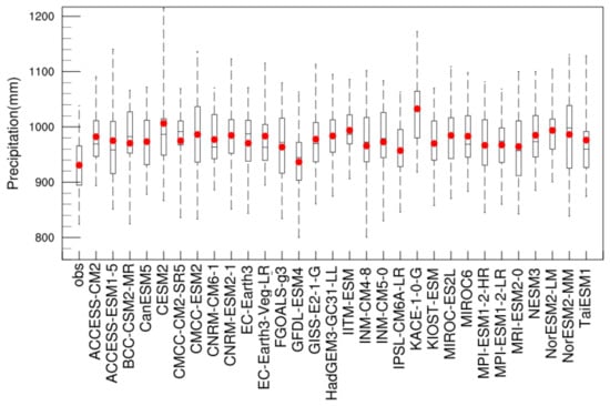 Box plots of annual mean precipitation for each model’s data and observation data from 1985 to 2014. • Average annual mean precipitation representing model data and observed data.