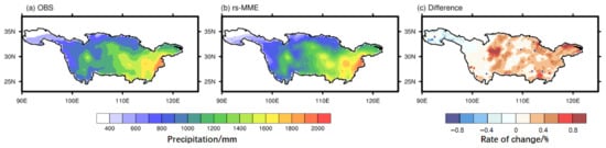 Spatial variation of observed data, revised rs-MME model, and rate of change in difference between observed data and revised rs-MME model for mean annual precipitation in the Yangtze River Basin (1985–2014).