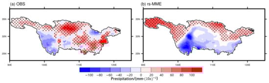 Spatial variation of linear trends in observed annual mean precipitation and revised rs-MME in the Yangtze River Basin (1985–2014). Note: Black dots indicate passing the significance test at the 95% confidence level.