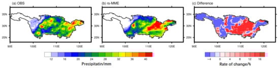 After conducting the aforementioned analysis, we proceed to adjust the bias using the weighted pooled-mode average of the RS scores. The observational data, the revised rs-MME outcomes, and the corresponding rate of change in their discrepancies will be presented individually. As depicted in Figure 3, the average annual precipitation across the Yangtze River Basin exhibits a west-to-east increase, ranging from less than 400 mm at the river’s source to 1200 mm in the middle reaches, and reaching 1600 mm in the lower reaches and mouth of the Yangtze River. The revised rs-MME demonstrates improved accuracy in capturing the intensity and the eastward rise in the spatial distribution of average annual precipitation in this area. The plot depicting the rate of change in the difference between modeled and observed annual mean precipitation (Figure 3c) indicates that the revised rs-MME marginally underestimates mean annual precipitation by approximately 0.4% in the headwaters and upstream regions of the Yangtze River Basin, and slightly overestimates it by less than 0.6% in the middle and lower reaches of the Yangtze River.
