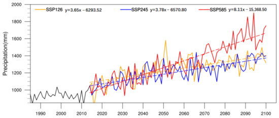 As depicted in Figure 7, the mean annual precipitation within the Yangtze River Basin is projected to undergo an increase throughout the 21st century across all three scenarios: SSP1-2.6, SSP2-4.5, and SSP5-8.5. These trends exhibit statistical significance at the 0.05 level (t-test), with noticeable rises in mean annual precipitation fluctuations as well. It is of significance to highlight that the SSP5-8.5 scenario manifests the most prominent upward trend, marked by a precipitation increase of 81.1 mm·. On the other hand, the SSP1-2.6 and SSP2-4.5 scenarios depict relatively modest upward trends, recording increases of 36.5 mm· and 37.8 mm·, respectively.