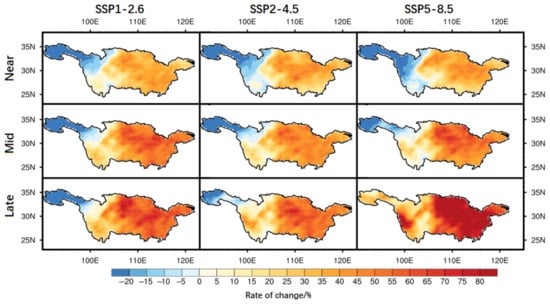In summary, the mean annual precipitation in the upper reaches of the Yangtze River Basin exhibits a pronounced decreasing trend across all scenarios, with the exception of the SSP5-8.5 scenario, which displays an increasing trend during the Late 21C period. Furthermore, the region characterized by a substantial increase in precipitation change rate is primarily situated within the middle reaches of the Yangtze River Basin. The augmentation of mean annual precipitation demonstrates a progressive increase over time. Importantly, among the three scenarios, the SSP5-8.5 scenario stands out for showcasing the most significant rise in precipitation.