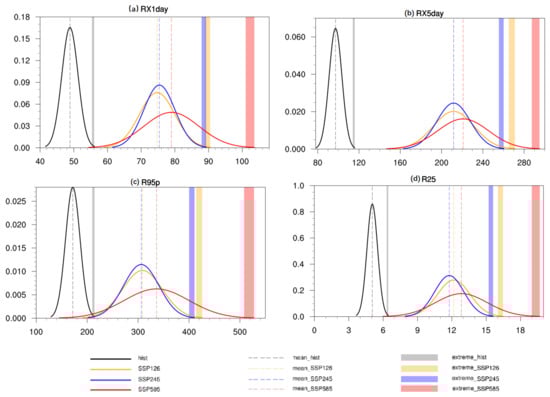 Normal distribution of extreme-precipitation index for different SSP scenarios in historical period and future. Note: The dashed line indicates the mean and the colored shaded area indicates the higher 5% distribution.