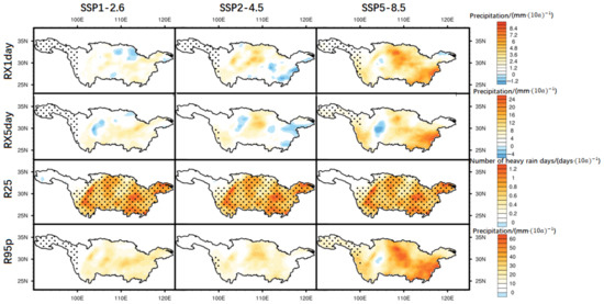 Spatial distribution of linear trend changes of the four extreme-precipitation indices in the Yangtze River Basin region under different SSP scenarios. Note: The black dots indicate that the significance test at 95% confidence level is passed.