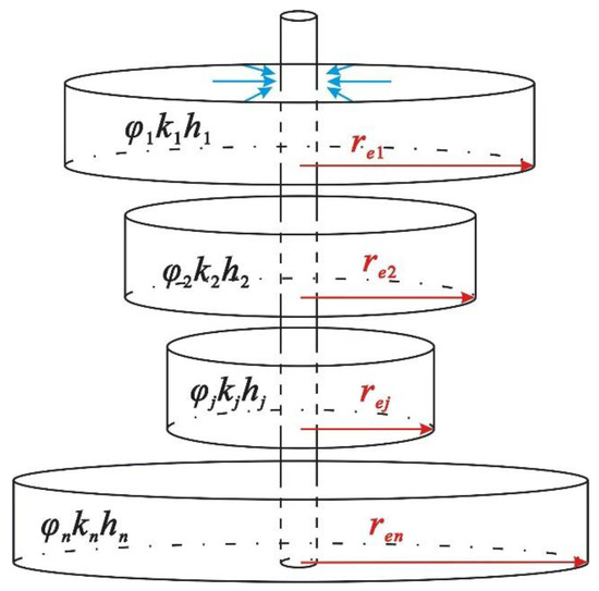 The investigation of unstable seepage flow in multi-layer commingled mining has been conducted since the 1960s, with numerous valuable studies undertaken by esteemed scholars [3,4,5]. Lefkovits et al. pioneered the application of analytical methods to investigate a multi-layer system model devoid of interlayer fouling, obtaining solutions for bottomhole pressure and production in a circular closed reservoir with an arbitrary number of layers, and conducting a comprehensive analyzing specifically focusing on the two-layer case. While the study holds significant importance, its practical utility is constrained by its failure to consider inter-layer crossflow. Russell and Prats conducted a comprehensive investigation on the multi-layer system model with crossflow, resulting in a novel solution for fixed bottom hole pressure, effectively addressing the limitations of previous research. The study conclusively demonstrated that inter-layer crossflow significantly influences the dynamic response of pressure during the transition stage from no crossflow to a single-layer homogeneous response. Additionally, scholars have extensively explored diverse initial pressure, boundary, porosity, and permeability conditions by integrating them into various models for further examination [6,7,8]. Papadopulos successfully resolved the issue of disparate pressures and pressure distributions across layers by obtaining an exact solution for a two-layer homogeneous and infinitely bounded aquifer model. Kucuk et al. developed an analytical solution applicable to scenarios involving distinct initial pressures and external boundary conditions in each layer, including complex cases featuring partial perforation, fractured wells, dual media, and external boundary conditions.