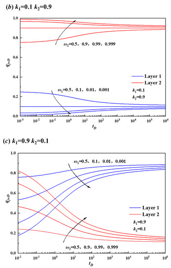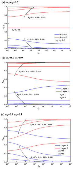The effect of permeability coefficient (k) on the contribution of stratification under different storage coefficients: (a) the storage coefficients of the first and second layers (ω1 and ω2) are 0.5 and 0.5, respectively, (b) the storage coefficients of the first and second layers (ω1 and ω2) are 0.1 and 0.9, respectively, and (c) the storage coefficients of the first and second layers (ω1 and ω2) are 0.9 and 0.1, respectively.